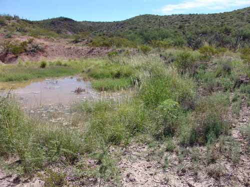 However, this pond sank rather rapidly, and stood mostly empty for two years thereafter, due to lack of wash-running rains. Here is a view below from April 2004: