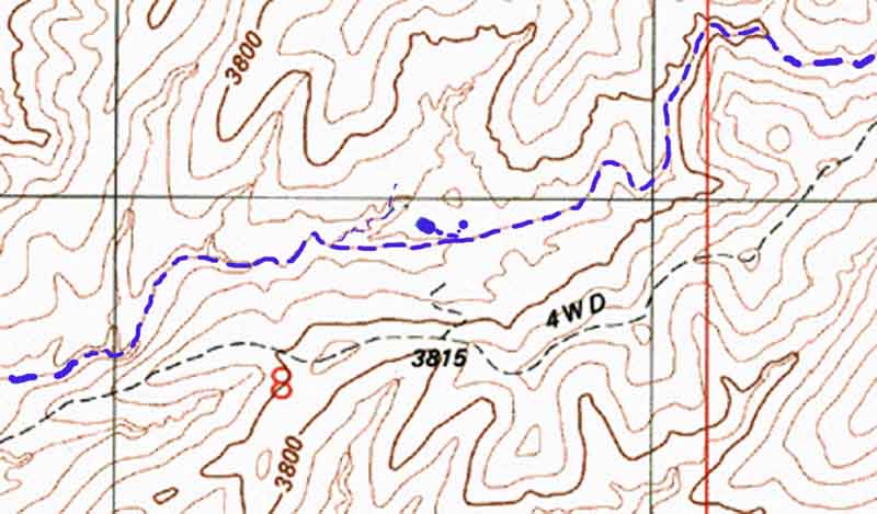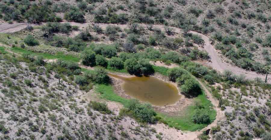 The Diversion Tank lies along the right bank of middle Pool Wash (that portion which lies above the confluence with the Big Tank Wash near the windmill at the top of Lower Pool Wash), in a stretch of that wash where the stream gradient is low. In the aerial photograph above, taken by Lynn Smith-Lovin on August 28, 2006 and looking toward the south, the green stripe at upper left marks the entrance of the diversion channel, while Pool Wash proper runs from just above it across the upper quarter of the image, curving to the middle where it exits at far right. The wash has several braidings along this stretch. The map below shows the Tank, with its secondary subsidiary, at map-center, with the Pool Wash Ridge Road roughly paralleling the wash.
