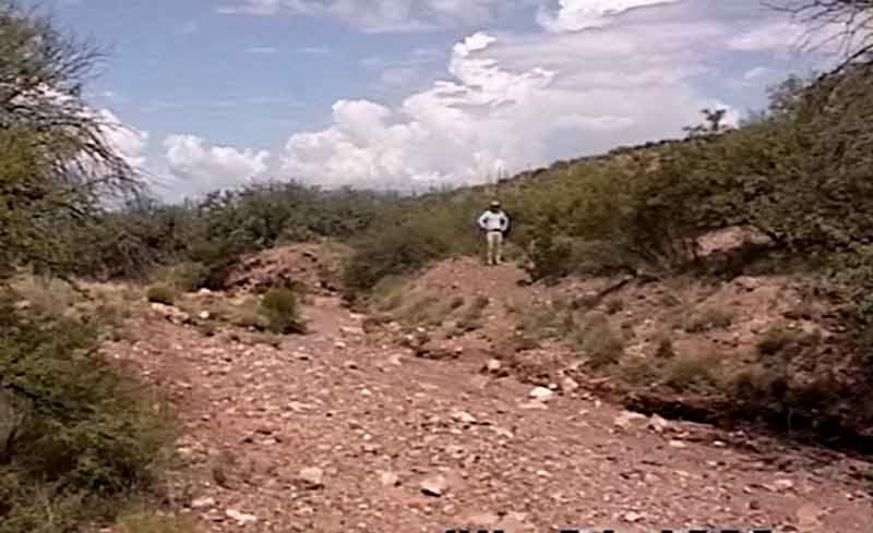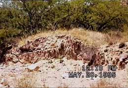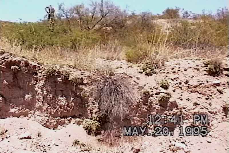 From the old entry point of the old Tank, one could see its archaeological remains, where the wash had cut through the old diversion berm, as well as the silt build-up which had filled the entry channel to foster the cut. Below Left, the old diversion berm in May 1995, at the point where it had been cut by main wash floods; in the Middle, the old berm -- now shown on the left, with the built-up silt infill on the right, a paler, grayer color than the berm; on the Right, in July 1998 just before we rebuilt the dam, in a view from further upstream, Tom Orum stands on the old silt fill, now well above the lie of the wash (which flows from lower right to upper left, belying the appearance in the photograph). (Click on each image to enlarge it.)