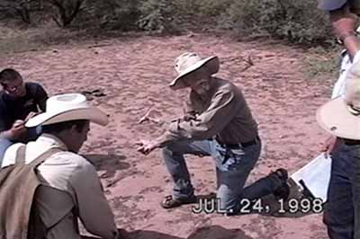 In 1998, Saguaro Juniper Corporation planned and proceeded to rebuild the Diversion Tank (and also its Secondary Tank just uphill from it, see further below). Below left: the old center of the Tank before reconstruction began; Right: Jim Corbett discussing Tank reconstruction with Don Decker (at near left) and other agents of the U.S. Natural Resources Conservation Service. (Click on each image to enlarge it.)