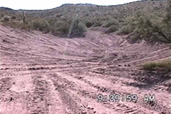 However, neither tank held water very well, and (again following years of drought) subsequent gullywashing rains in the summer of 2006 filled the Diversion Tank full, but it again leaked out rapidly, with visible flow running down the adjacent wash. It seems probable that this leak is facilitated by the root structures of the large mesquite trees left standing on the downstream side of the berm when the tank was rebuilt (though faulty bentonite-laying techniques also cannot be ruled out; however, this was the final watertank we bentonited, and we increased the density of Bentonite put into the floor of the basin).