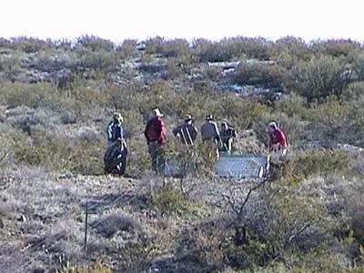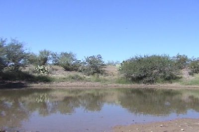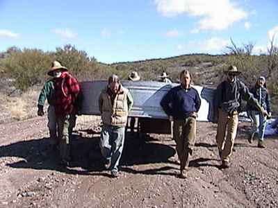 We built the Fenceline Drinker in January of 2001. It straddles the fence which divides our Cascabel Pasture grazing lease in Section 2 from Saguaro Juniper deeded land in Section 1, thus enabling us to move cows into either pasture according to needs and conditions. We walked the two tanks down the wash below the Strawbale Ridge Road rather than driving a motorized vehicle to the fenceline: