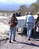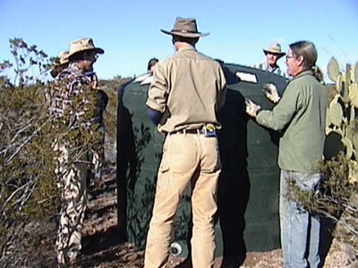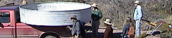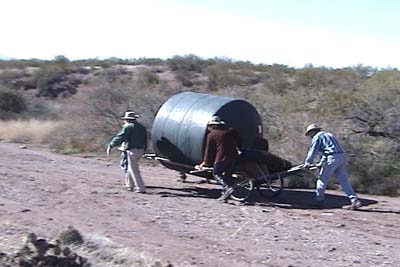 Installing the drinker tank at the fenceline (the water is solar-pumped from a well near Cascabel Road):