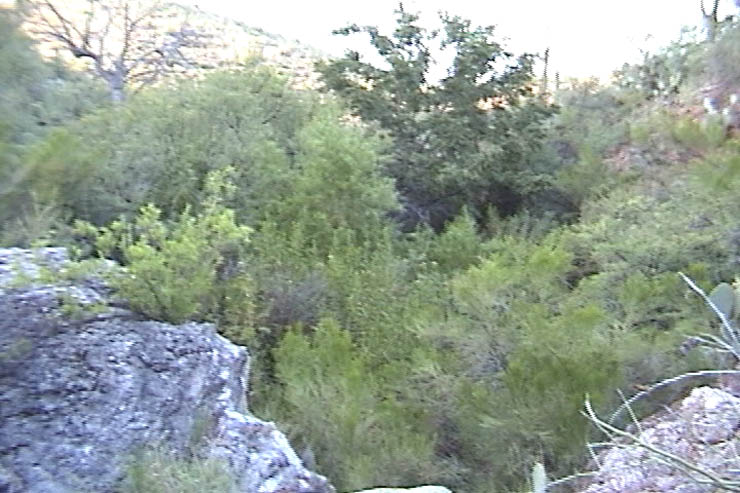 Here, below, is a view of the Sierra Blanca Spring taken in August 2001 upstream from the lip above the Spring and looking downstream. The dark-green-leafed tree at right center is an Arizona Walnut (most of the others are Willows). Note the calcite veins in the rock of the lip, just visible in the morning light.
