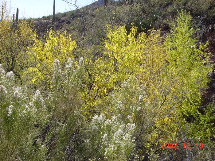Below, in December 2002, taken from a position left of the one above, the walnut tree has lost its leaves while the willows have become a bright yellow. (Desert Broom is in the foreground, sprouting from the edge of the lip above the spring):
