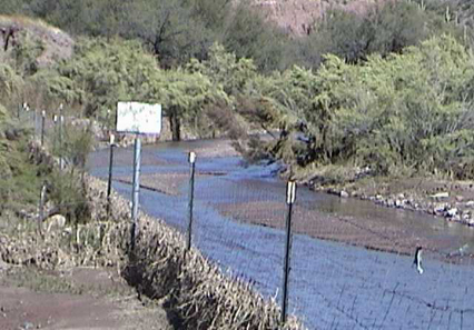 Receding floodwaters run along the Windmill erosion control fence, October 2000.