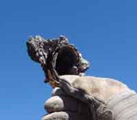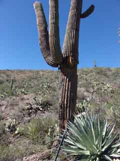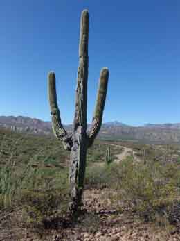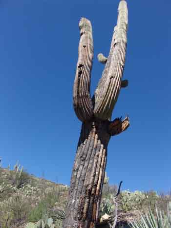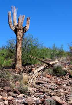 On September 24 (nearly two weeks later), we returned down the same trail, to see the same saguaro, shown at left, has lost both another of ts arms and the top of its central trunk. Click on the image to enlarge it.