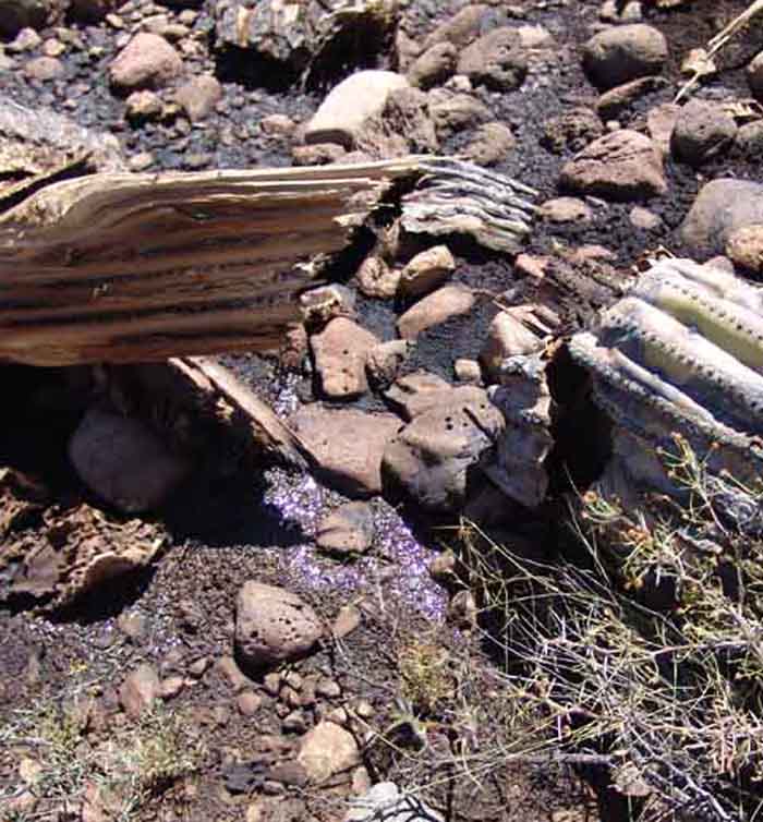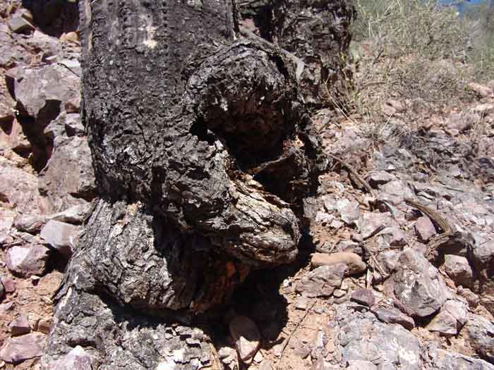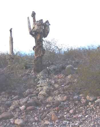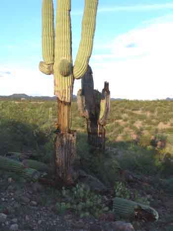On August 19, 2004, we observed that two of the big saguaros on the hillside just below the Hot Springs Canyon Airport had recently been blasted by lightning. One, below left, directly hit (and its tops and branches blown off), was bleeding its waters out in a sticky but fluid mass. Below right, the second Saguaro (a few yards away) was also blasted at its base, presumably by the explosion of the first, both of them now effectively dead. Click on each image to enlarge it.