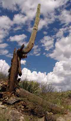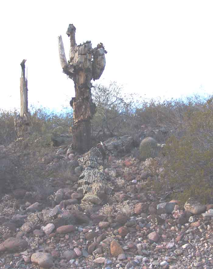 Below, on July 08, 2006, almost two years after the lightning strike, the first saguaro has now become an almost elegant skeleton (while its mate to the left has fallen). (Click on the image to enlarge it.)