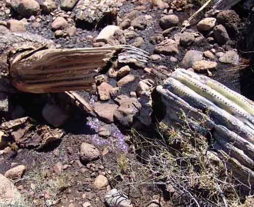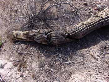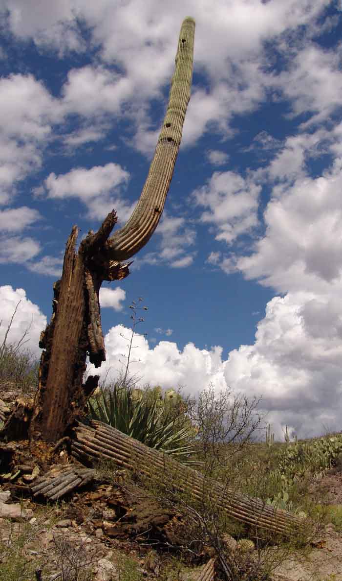 The second saguaro, at far left, has lost its entire branching superstructure, while the skin of the first continues to slough off the now-dry trunk. The skin of the fallen limb approaching the viewer has slumped into a broken mass looking like weathered cardboard.
