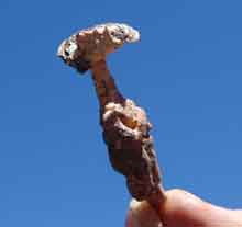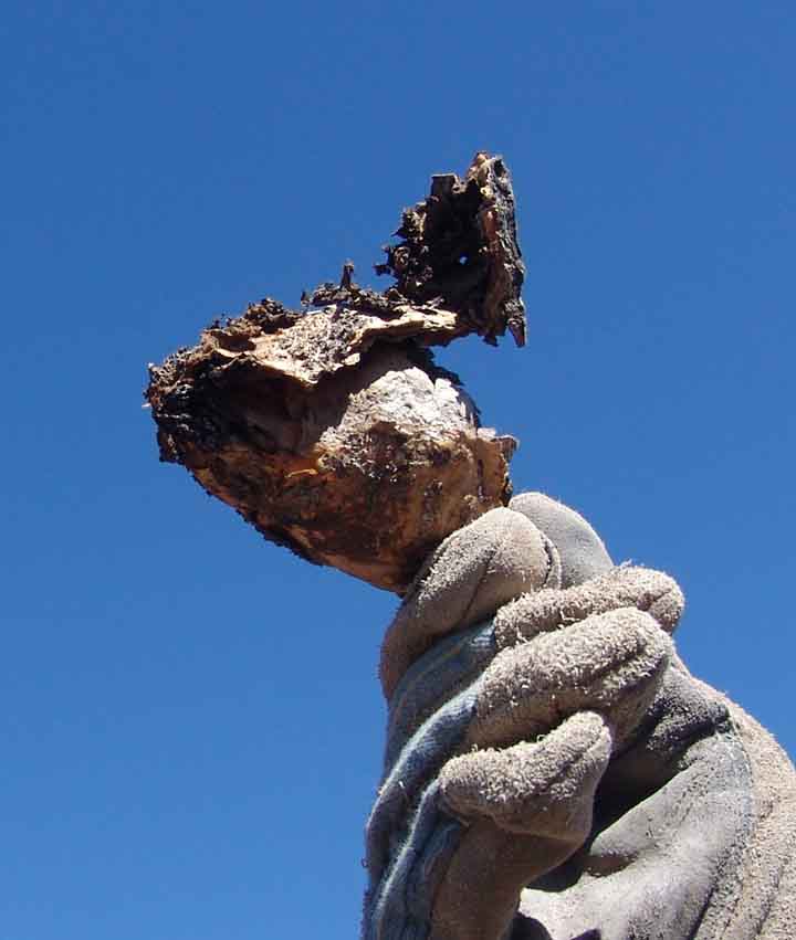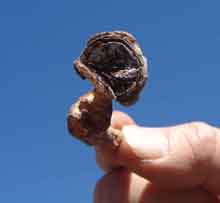 Birds -- mainly woodpeckers (including, prominently, Flickers in our area) -- drill quite large holes in the sides of saguaros in order to construct their nests (for example here, at left). Healthy saguaros respond to this invasive insult by constructing a protective surface at the site of the attack. These interior-protecting surfaces become permanent structures, and are called "boots", since when the plant collapses, the structure.remains as a sturdy, hollow testament to the injury. Below is an example of a very small one, found beside a recently collapsed old tree. (Click on each of the images to enlarge them.) This one, probably drilled by a Flicker, was presumably a "test-hole", abandoned by the bird. But the tree was forced to build the protective structure around the hole nonetheless, as a response to the bacterial infections that naturally follow the injury.