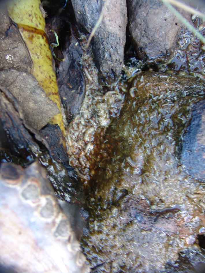 If you look closely at the left-hand image above, you'll see that the trunk is glistening -- it was actually running liquids, very very slowly. The smell was almost overpowering -- not exactly repulsive but certainly very strong and unique (unforgettable). The waters were thick all around the basal area, and they look like they're flowing, but -- as you can see in the image below, it's really myriad maggots feeding on the gooey mix, many thousands of them churning things up and making a collective sound like running water. (Click on the image to enlarge it.)