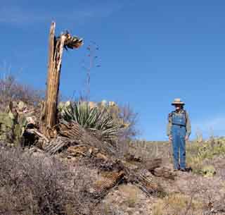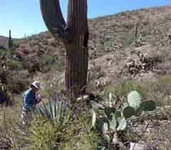 When the tree's defenses are weak and the weather is warm, the collapse happens fast. We saw an example of this in September 2004. On September 9, we hiked down into Sierra Blanca Spring Wash past an old Saguaro we had seen there many times before. This time, however, we saw at first glance that it had lost some of its arms (at left). (Click on each of these three images to enlarge it.) Some of the arms seemed to have been ripped right out of the tree, probably by a strong wind. There was no evidence of lightning. The middle image shows Tom Orum taking some notes -- see the hole on the right in the enlarged image, as well as the broken arm opposed to it. This suggested a very powerful wind indeed. But looking at more closely, on the right, we could see the characteristic rot at the base indicating internal structural collapse rather than external forces.