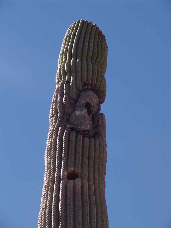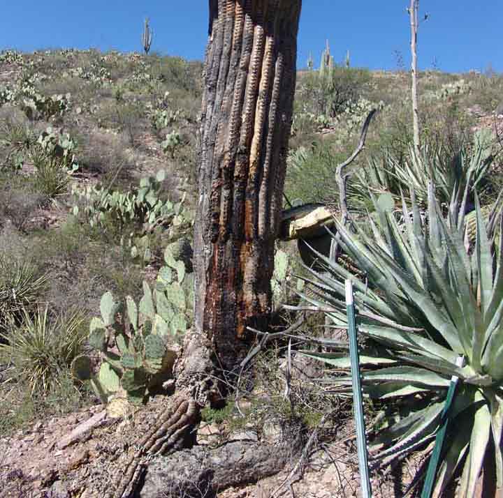 A number of agents and processes produce injuries to the protective tissues of Saguaros -- more gradual agencies include birds, insects, and freezing temperatures, while lightning strikes and wind gusts produce more instantaneous damage.