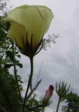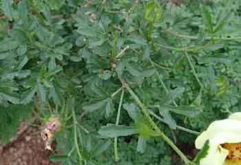 The cup-shape is evident in the image at left. The image below shows an array of leaves at the top of the plant, but the lower leaves, which are not lobed but undivided, are not visible here. (Click on the image below to enlarge it.)
