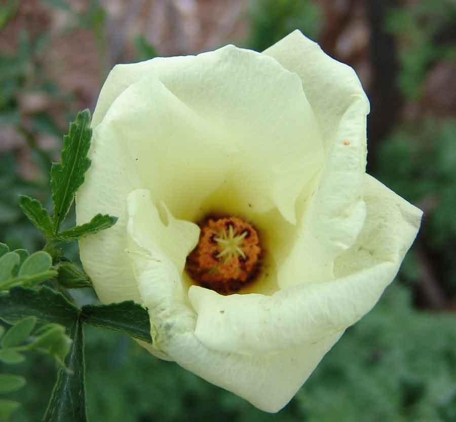 This hibiscus flower is cup-shaped, with 5 rounded petals and a distinctively red basal spot. You can see two of the upper leaves at the left edge of the flower, dark green and toothed with 3 lobes.