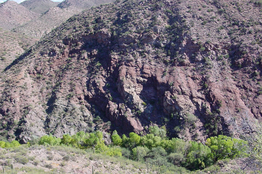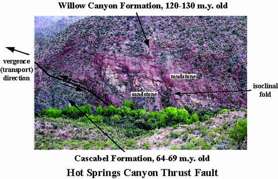 A broader sense of the forces involved in this thrust-faulting may be gained from viewing a geological map of the relations between the Willow Canyon and the Cascabel Formations in the landscapes around Hot Springs Canyon:
