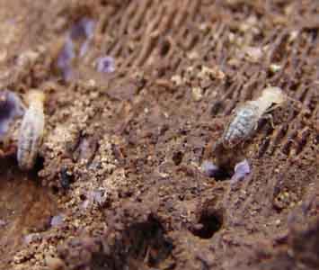but looking across the wood more generally we saw that a number of tiny termites were very slowly moving about over and around the fungus. They seemed to be closely associated with it: (Click on each image to enlarge it.)