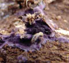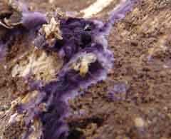 In February 2005, after ample winter rains, we turned over an old tree stump which had lain on its side for more than a year on a terrace in lower Hot Springs Canyon. Doing so, we found the damp, exposed underside of this stump to be covered in a number of places with a purple fungus: Looking at it closely, it was clear that it formed only a thin layer on the damp wood,