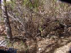 Like true willows, Seep-willow has straight, slender stalks and long narrow deciduous leaves, and it grows in similar sandy floodplains. But it remains a bush in size (up to 12 feet tall at the most; usually less) and branches from the ground (note the mature bush, above right, with its numerous now-dead earlier branches spread out at the base). The pattern shows more clearly in the February image at right (Click on the image to enlarge it.)